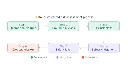 SORA stands for Specific Operations Risk Assessment. Developed through JARUS and adopted by the CAA, it’s the framework operators must use to demonstrate that a proposed BVLOS operation is safe before applying for advanced permissions.