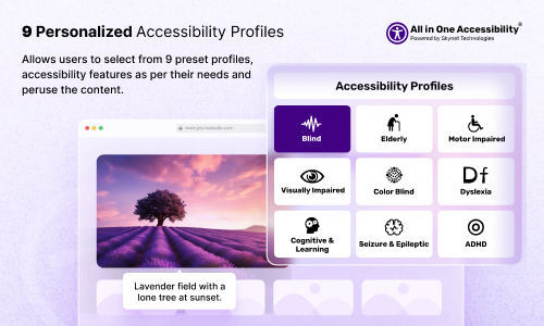 - Localized accessibility profiles: Users can select accessibility profiles (such as “Blind”, “Motor Impaired”, “Color Blind”, “Dyslexia”, “Visually Impaired”, “Seizure & Epileptic”, “Elderly”, “ADHA” or “Cognitive & Learning”) in their native language, combining localization and accessibility for personalized usability.