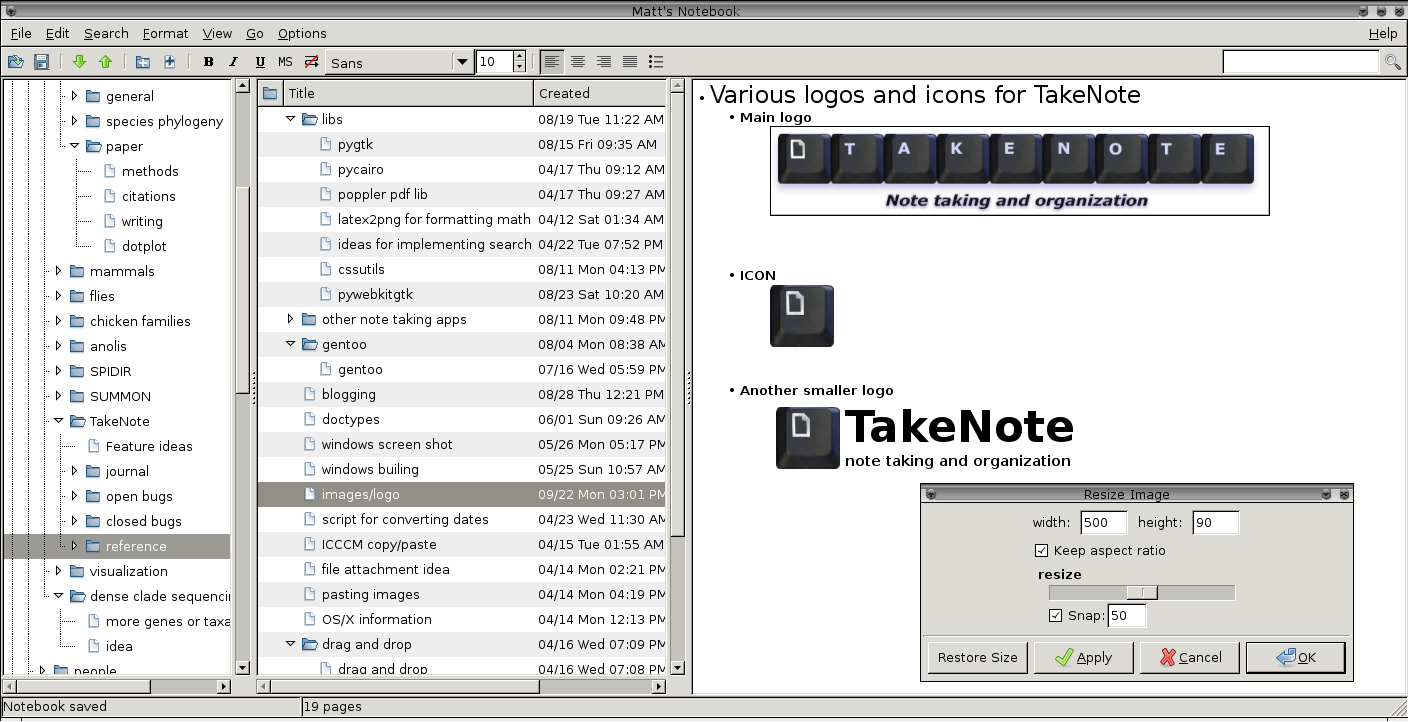 KeepNote allows you to organize various types of notes such as class notes, to-do lists, research notes, journal entries, and paper outlines within a straightforward notebook structure that supports rich-text formatting, images, and more. With its full-text search capability, accessing any note for future use is effortless. The application is built to be cross-platform, utilizing Python and PyGTK, and it saves your notes in easily manageable file formats like HTML and XML. Transferring or archiving your notes is simply a matter of zipping or copying a folder. Furthermore, KeepNote offers a feature to personalize the icons associated with your notes; to modify an icon, simply right-click on the note and select the Change Icon option. A variety of icons will then be presented for selection, enabling you to highlight your notes as favorites (heart), significant (star, exclamation mark), or completed (check mark). Additionally, this customization enhances the visual organization of your notes, making it easier to prioritize and manage your tasks effectively.
