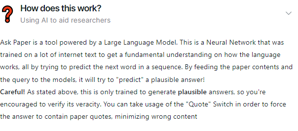 Ask Paper provides a streamlined way to quickly read and gather insights from academic papers. Users can upload documents either through a URL link or by directly uploading a PDF file, enabling them to pose questions in natural language regarding the content of the paper. This innovative tool utilizes advanced neural network technology, designed to comprehend language intricacies by predicting subsequent words in text sequences. By inputting the paper's details along with your inquiries, it generates likely responses based on its extensive training. To get started, simply create an account on Discord and join our dedicated server. For those requiring additional assistance, guest login options are available, offering the ability to receive helpful instructions via email on effectively navigating the tool. With Ask Paper, you can enhance your research efficiency significantly.