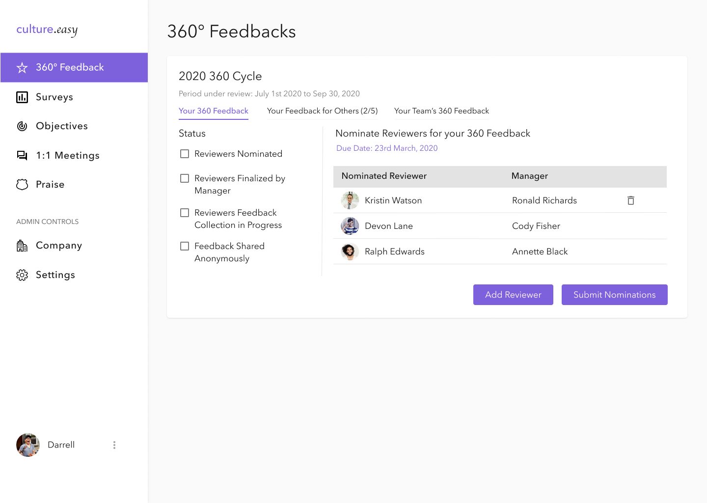 Culture.easy offers a proven toolkit that helps companies shape their culture. OKR Management is one example. OKR Management makes it clear what the leadership goals are and how they affect the employees and teams. A clear and transparent view of the company's progress day-to-day gives everyone clarity and meaning. Other culture-enhancing features include 360 Degree Reviews and Employee Surveys, Employee Performance Reviews, and Praise Wall.