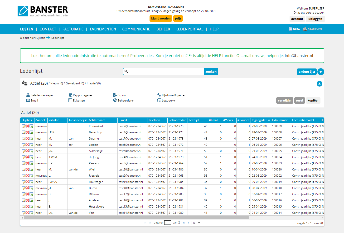 Numerous organizations continue to rely on a package stored at an individual's residence or depend on Excel spreadsheets for their operations. Banster's online membership management system provides a wealth of features at an affordable price, designed to accommodate both large and small organizations with flexibility and efficiency, all while ensuring high availability and security. Our service-oriented approach, which emphasizes personal commitment, makes each customer feel valued and heard. For nearly a decade, we have remained dedicated to this goal. Banster delivers a comprehensive membership administration system with unlimited customizable fields; it allows access for multiple users with varying permissions; it offers invoicing and contribution collection, including options for Direct Debit (SEPA), iDeal, PayPal, and credit card payments; members have the ability to update their own information; there's a dedicated member portal designed in your own branding; and an events module that facilitates event organization and invoicing, along with the capability to send newsletters via email or SMS. With Banster, organizations can streamline their membership processes and enhance member engagement effortlessly.