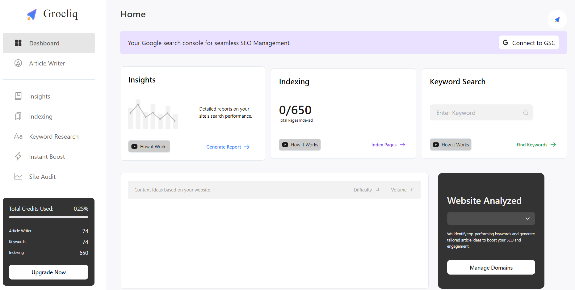Grocliq is an AI-driven SEO software designed specifically for ecommerce brands. It helps them to increase their online visibility and grow. Users can quickly create high-quality content that is free of plagiarism and optimized to rank well in search engines with its AI Article writer. The AI Keyword Explorer helps users find low-competition, valuable keywords that can improve content strategy and rankings. Grocliq Instant Indexing ensures that content is indexed faster by search engines, helping businesses to achieve results more quickly. The platform provides users with insightful reports on clicks and impressions as well as rankings. This allows them to track performance and make informed decisions. Grocliq is designed for business owners, agencies, and freelancers. It simplifies SEO, provides the tools needed to build an effective SEO plan, and helps users climb search engine ranking effortlessly. Grocliq unlocks the full potential of any website!