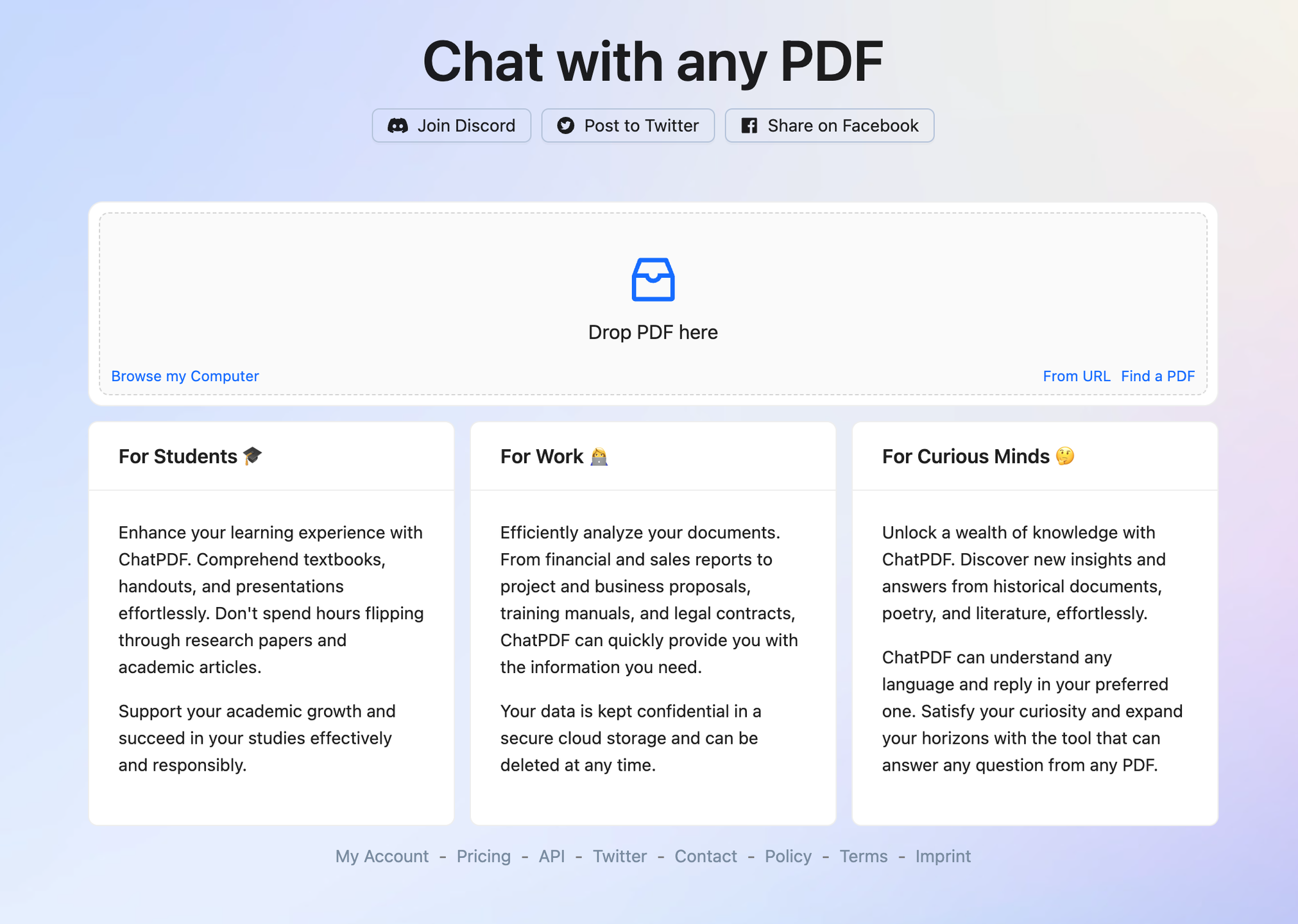 Open the door to endless knowledge with ChatPDF. Effortlessly uncover insights and responses from historical texts, poetry, and literature. ChatPDF is capable of understanding any language and can communicate in your choice of language. Explore your curiosity and broaden your understanding with this versatile tool that can address inquiries from any PDF document, making knowledge accessible to everyone. Furthermore, with its user-friendly interface, ChatPDF encourages continuous learning in an engaging way.