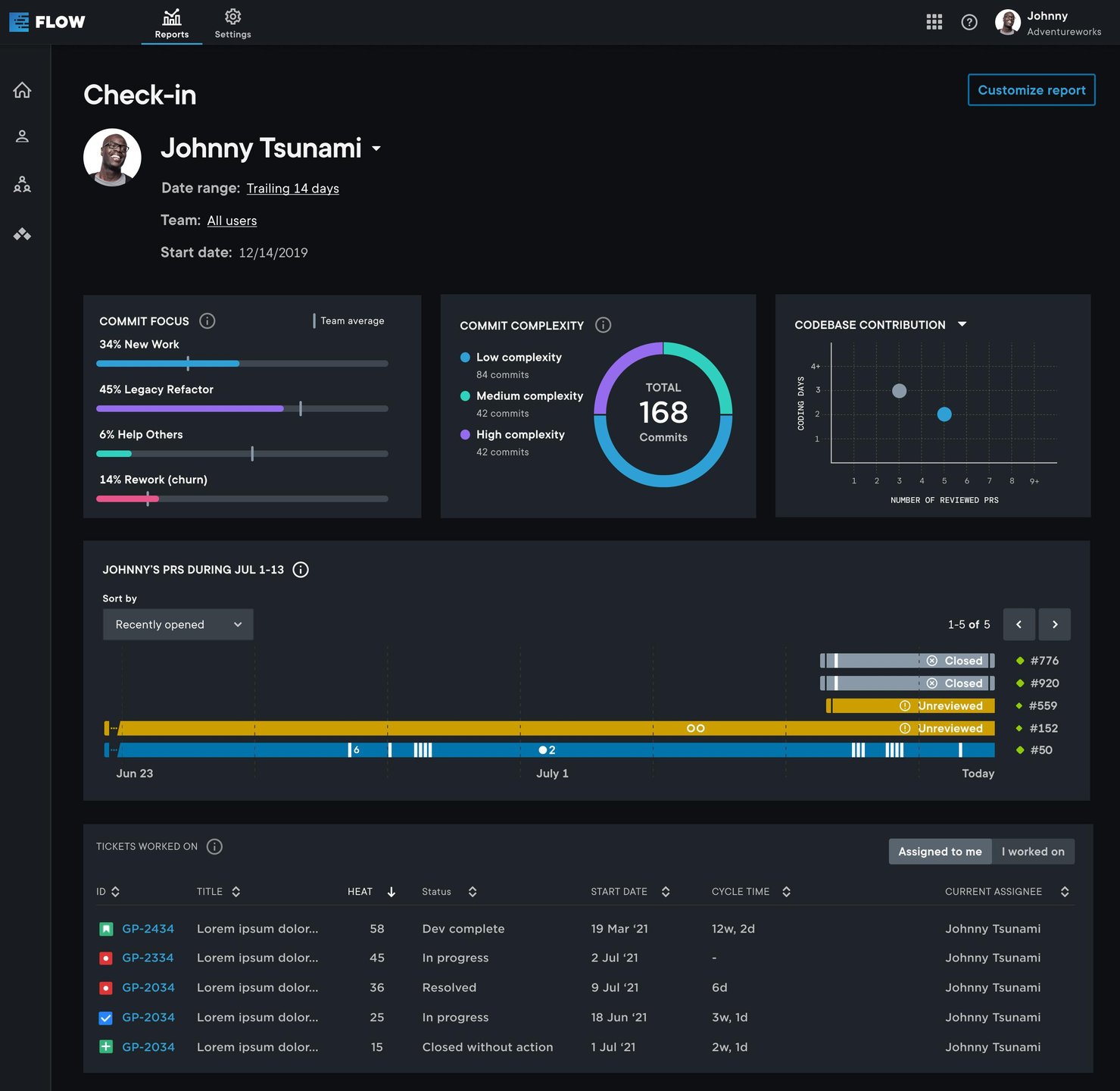 Engineering teams can increase their team's product delivery speed by identifying and removing developer friction and building healthy software development patterns. Flow provides engineering teams more understanding into their team’s workflow patterns which then enables them to identify bottlenecks, compare trends and help their team to build better.