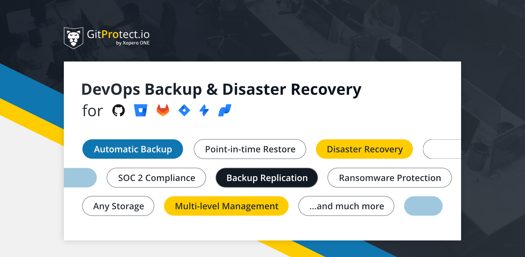 You can choose from a predefined plan, or create your own plan to backup Bitbucket, GitHub, and other storage according to your schedule. Are you looking for a new repo? It will be added to the plan automatically. We keep you informed so you can rest assured. You can check it yourself using a super-friendly web dashboard. This dashboard shows you audit logs and stats. GitProtect is based on Xopero Software's 10 years of backup experience. Access to enterprise-class encryption, retention, compression, and other features for free. Git restore is not something you can do by yourself. You can immediately restore GitHub and Bitbucket data to your local repository, crossover, or other device. Automatic, recurring repository backup. GFS - long-term, efficient retention and git archive Git restore to a new repository, or a local device.
