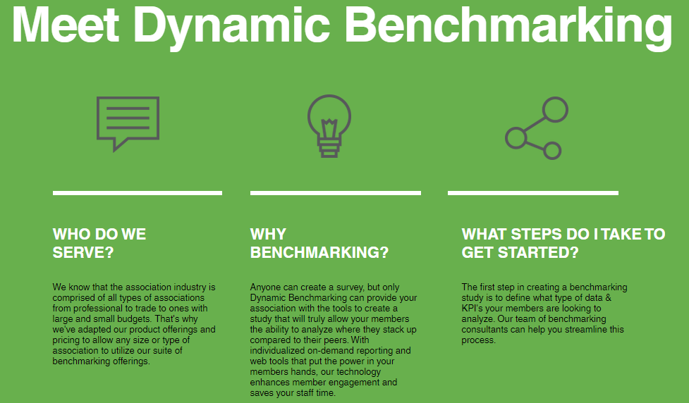 The association sector encompasses a wide variety of organizations, including both professional and trade associations, which operate with varying budget sizes. To cater to this diversity, we have tailored our product offerings and pricing structures, enabling any association, regardless of its size or type, to take advantage of our comprehensive benchmarking solutions. While many can design a survey, only Dynamic Benchmarking equips your organization with the necessary tools to develop a study that empowers your members to evaluate their performance against their peers effectively. Our individualized, on-demand reporting and user-friendly web tools place the analytical power directly in the hands of your members, thereby increasing engagement and freeing up valuable time for your staff. The initial phase of launching a benchmarking study involves determining the specific data and key performance indicators (KPIs) that your members wish to explore. Our expert team of benchmarking consultants is available to assist you in optimizing this process, ensuring that your association can derive the maximum value from its benchmarking initiatives. Ultimately, our goal is to foster a collaborative environment where associations flourish and members gain critical insights into their relative standing.