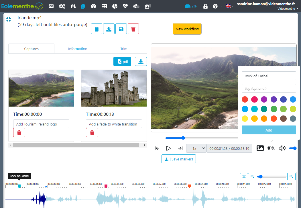 EolePreview is the collaborative preview and annotation function for video projects: image capture for annotation down to the timecode, live chat between producer and customer, and PDF report.