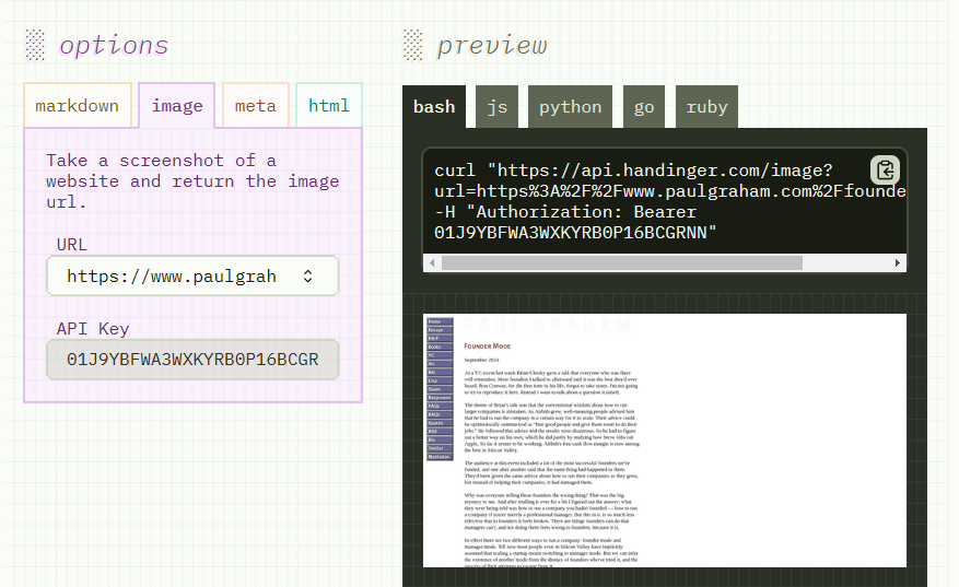 You can easily retrieve data without any coding skills by simply calling an HTTP endpoint. This approach is particularly useful for training large language models or for storing information in a personal knowledge repository. It's also beneficial for training visual models or obtaining web thumbnails. Users can extract various elements from a website, such as images, titles, and descriptions, making it ideal for specific content extraction tasks. Additionally, you can fetch website content and convert it into Markdown format, although it may inadvertently remove some crucial details along with irrelevant information. Another feature allows you to take a screenshot of a website and receive the image URL. You can also extract the most prevalent metadata from a site and get it in JSON format. Furthermore, the service enables you to fetch website content and return it in HTML format. While there is a rate limit in place, it is quite accommodating at 1,000 requests per minute, allowing for efficient data extraction while maintaining fairness and reliability for all users. Overall, this is a straightforward HTTP endpoint that simplifies the process and makes it accessible without the need for programming knowledge.
