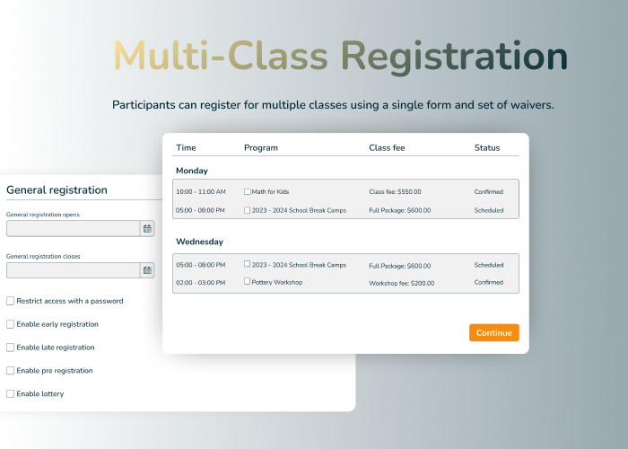 Revolutionize your online registration process with Jumbula! Our all-in-one software offers a modern administration dashboard, intuitive user experience, and advanced management and marketing tools. Perfect for organizing classes, camps, childcare, and after-school programs, our solution will automate your registration process, boost participation, and provide valuable insights to help you make informed decisions. Say goodbye to manual processes and hello to effortless, efficient registration. Sign up for a free trial today and experience the power of Jumbula