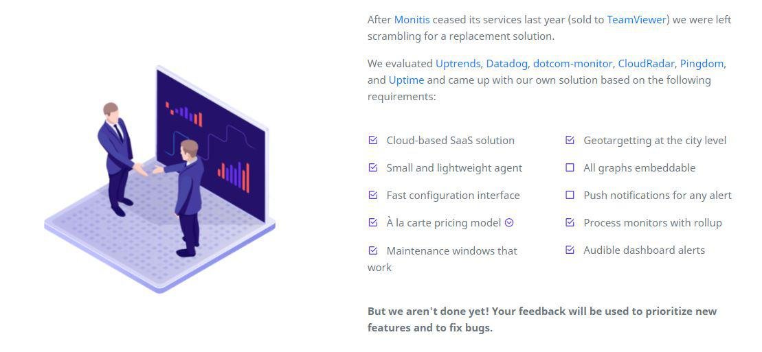 Simplifying infrastructure and endpoint monitoring has never been easier! Following the discontinuation of Monitis after its acquisition by TeamViewer last year, we found ourselves in urgent need of an alternative solution. We explored various options, including Uptrends, Datadog, dotcom-monitor, CloudRadar, Pingdom, and Uptime, ultimately crafting our own solution with specific criteria in mind: a cloud-based SaaS platform, a compact and efficient agent, a quick setup interface, flexible pricing, effective maintenance windows, city-level geotargeting, embeddable graphs, real-time push notifications for alerts, comprehensive process monitors with rollup capabilities, and audible alerts on our dashboard. Central to our approach is a small, lightweight server agent, just 2.1 MB in size, which once installed and paired, initiates a "heartbeat" report every minute to our ingest API within your network. By leveraging this solution, users can effectively monitor, analyze, and enhance their website's performance along with the overall end-user experience, ensuring that all critical aspects are covered seamlessly. The combination of these features allows for a tailored approach to monitoring that meets diverse needs.