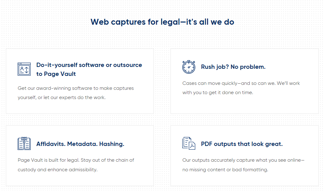 Obtain our acclaimed software to handle captures independently, or allow our specialists to take care of it for you. Cases can progress rapidly, and we can match that pace. We collaborate with you to ensure timely completion. Whether through an online form, email, or a phone conversation, simply inform us of your capture needs. Our team will assess your request and provide you with a quote. We are equipped to manage urgent jobs, so don’t hesitate to reach out! After you approve the quote, Page Vault will execute the captures and deliver them to you. Our dedicated attorney, technical team, and customer support staff understand your requirements and are ready to assist you. From offering advice on capture specifics to aiding in investigations and site assessments, we are here to help you determine your needs and see the project through to completion. Your success is our priority, and we are committed to ensuring a seamless experience.