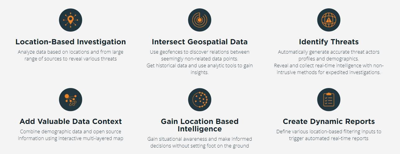 With vast amounts of location-centric data woven into the complex web ecosystem, our clients gain access to geolocated insights at their fingertips. Our state-of-the-art location solution effortlessly uncovers and interprets location-based data through dynamic maps. In today's landscape, critical insights often stem from open-source information. However, the task of locating and extracting pertinent location intelligence remains a significant hurdle, along with the need to effectively yield smart insights from extensive and intricate data signals. Bridging the gap between open-source web data and live, real-world information creates a more complete picture of intelligence. Our geospatial intelligence platform provides valuable insights regarding locations, individuals, and data points that matter to various organizations. By leveraging our distinctive capabilities, we enhance public safety through the automatic analysis of location-based information, facilitating the creation and distribution of intelligence and investigative reports while contributing to informed decision-making processes across sectors.