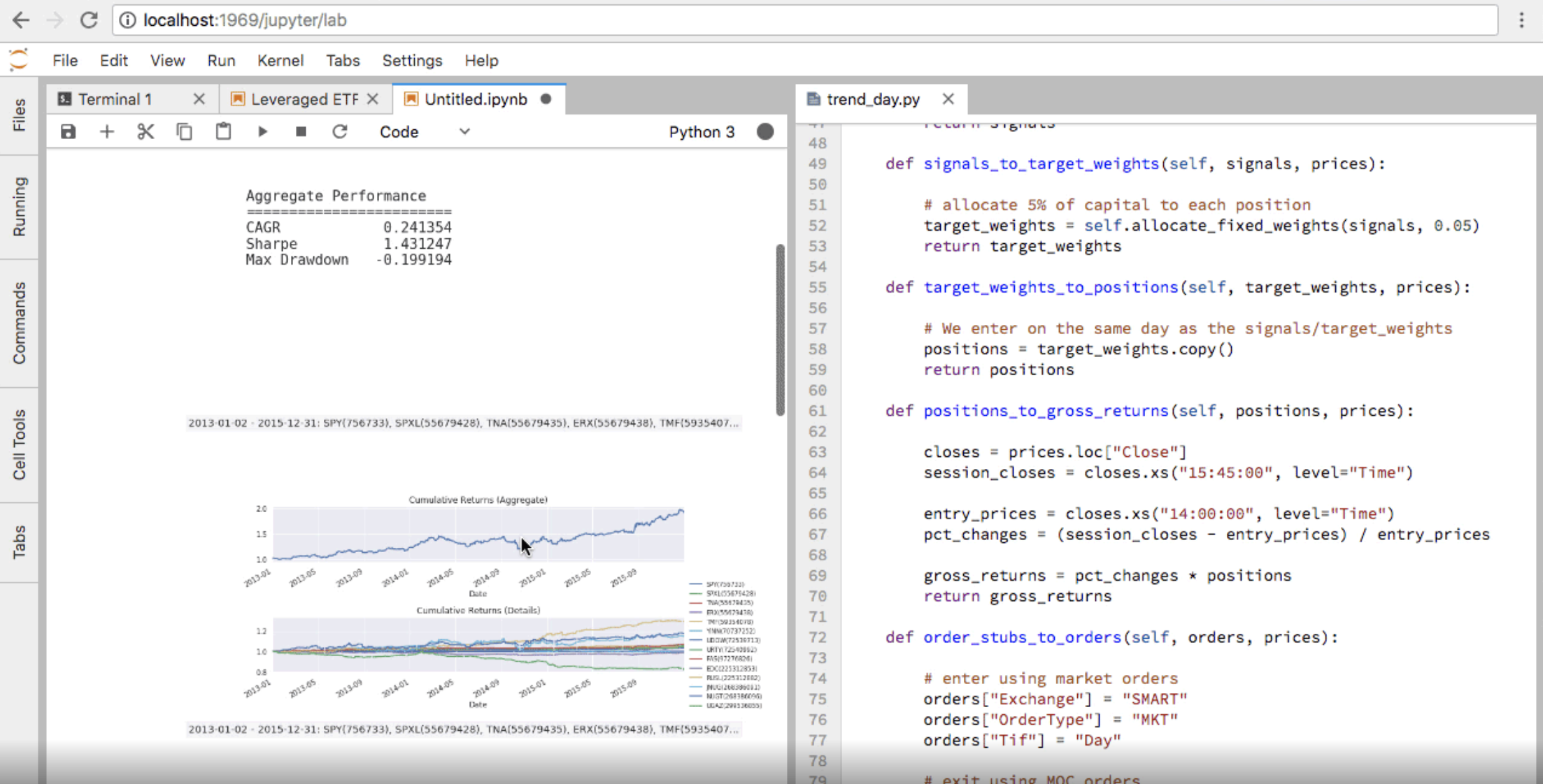 QuantRocket is a Python-based platform for researching, backtesting, and trading quantitative strategies. Built on Docker, QuantRocket can be deployed locally or to the cloud and has an open architecture that is flexible and extensible. It provides a JupyterLab environment, offers a suite of data integrations, and supports multiple backtesters: Zipline, the open-source backtester that originally powered Quantopian; Alphalens, an alpha factor analysis library; Moonshot, a vectorized backtester based on pandas; and MoonshotML, a walk-forward machine learning backtester.