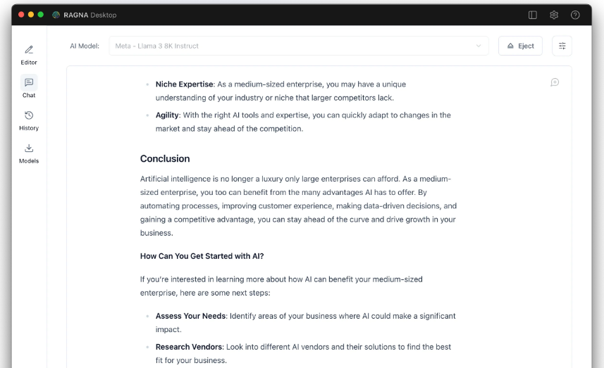 RAGNA Desktop is a private AI multitool that operates directly on your desktop or laptop, eliminating the need for an internet connection. This application is specifically crafted to streamline repetitive tasks, boost productivity, and allow you to concentrate on what truly matters. It prioritizes security and data safeguarding for your business needs. In today's corporate landscape, the protection of sensitive information is critical. With RAGNA Desktop, you can rest assured that your data remains secure and entirely on your device. All artificial intelligence processes, along with computations and analyses, take place locally on your machine, ensuring that even the most confidential information is kept private. The lack of internet connectivity significantly reduces the chances of cyber threats and data breaches, as no information is sent to the cloud. Furthermore, our application is meticulously designed to adhere to current data protection laws, including GDPR and other pertinent regulations, giving you peace of mind while you work. By using RAGNA Desktop, you not only enhance your operational efficiency but also reinforce your commitment to safeguarding your business's valuable data.
