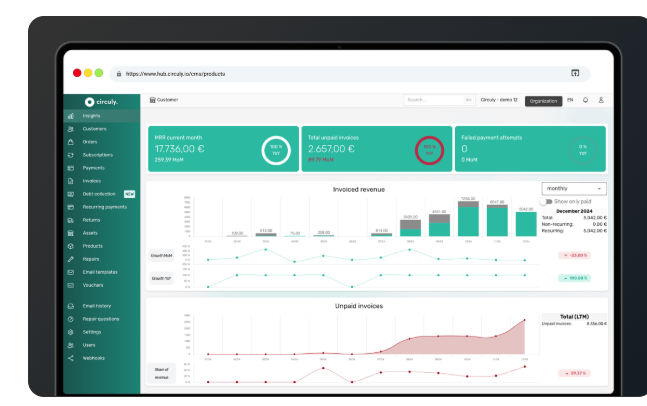 Circuly is a specialized B2B SaaS platform designed for organizations aiming to transform physical products into subscription, leasing, rental, or product-as-a-service models, by integrating all operational elements into a single system to streamline the launch, management, and scaling of subscription services. This comprehensive solution encompasses subscription lifecycle management, automated recurring billing and invoicing, customer and order management, payment collection and reminders, asset tracking, and workflows for returns and repairs, while providing valuable insights into product lifecycles through a centralized hub that seamlessly connects with existing storefronts and payment systems via APIs. With features such as adaptable plan configurations, automated invoices and reminder systems, integrated tracking of products by serial numbers, personalized transactional communications, and built-in capabilities for handling buyouts and taxes, Circuly empowers teams to minimize manual tasks, enhance cash flow management, and consolidate data across sales, logistics, and finance departments. By offering these tools, Circuly not only simplifies operational processes but also enables businesses to gain a competitive edge in the evolving subscription economy.