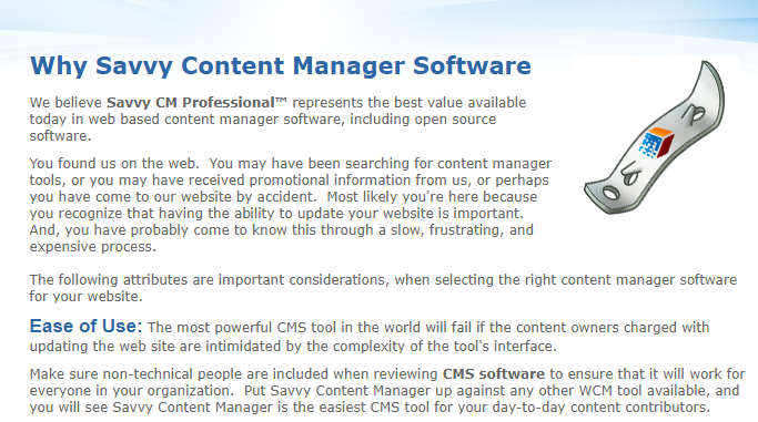 We are confident that Savvy CM Professional™ offers unparalleled value in the realm of web-based content management software, even when compared to open-source options. You may have stumbled upon us during your online search for content management solutions, received our promotional materials, or perhaps found our site by chance. However you arrived, it’s likely that you understand the significance of being able to update your website efficiently. This realization often comes from a tedious and costly experience. It is essential to involve non-technical staff in the evaluation of CMS software to guarantee that it meets the needs of all users within your organization. When you compare Savvy Content Manager to any other web content management tool on the market, you'll discover that it stands out as the most user-friendly option for your everyday content contributors. Our commitment to simplicity and effectiveness makes Savvy CM Professional™ a top choice for businesses seeking a reliable content management solution.