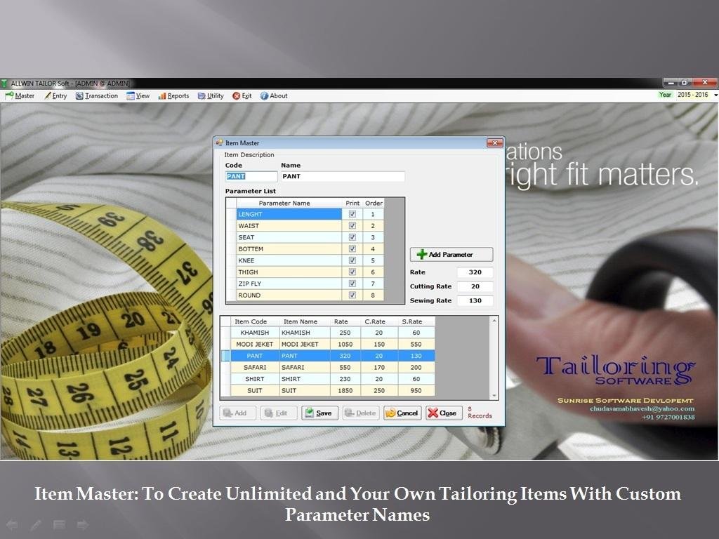 Sunrise Tailoring Software stands out as the ultimate solution for innovative tailors and is the ideal choice for any tailoring shop. Not only is it incredibly straightforward to learn and operate, but it also delivers remarkable performance. This comprehensive tailoring management software encompasses all aspects of tailoring business transactions and provides the essential information you need in a timely manner. Our main focus lies in developing Tailoring Software and Custom Software Solutions, leveraging our experience with numerous professional tailors to create exceptional software tailored to their needs. Widely embraced in the industry, our solution is utilized by hundreds of savvy tailors and boutiques who effectively manage and advance their tailoring enterprises with ease and efficiency. Users can create an unlimited number of tailoring items while defining their measurement parameters and pricing according to their preferences. Examples of items include shirts, pants, suits, blouses, and salwars, among others. Additionally, it enables the organized management of customer details, allowing for the storage of item-specific measurement parameters for easy access whenever needed. This software truly empowers tailors to streamline their operations and focus on growth.