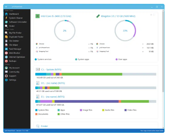 jv16PowerTools is your one-stop shop for true PC performance. Our system can tell which files should be deleted and which files to keep safe. This will ensure that your computer runs smoothly. Improves your Windows PC stability. System scans for errors, leftover software, and other junk. For better privacy, remove tracking cookies from your browser. Unwanted programs can be removed intelligently Cleans up any leftover software. You can easily delete unwanted software and Windows apps that you don't use. You can search for files and data quickly. Search for any file or registry data using search words. You can also list all programs installed and quickly locate lost documents. Write-protected and locked files can be deleted. You can quickly and easily access system usage information from your home screen. Close unneeded apps. Find files quickly, and then use our many tools.