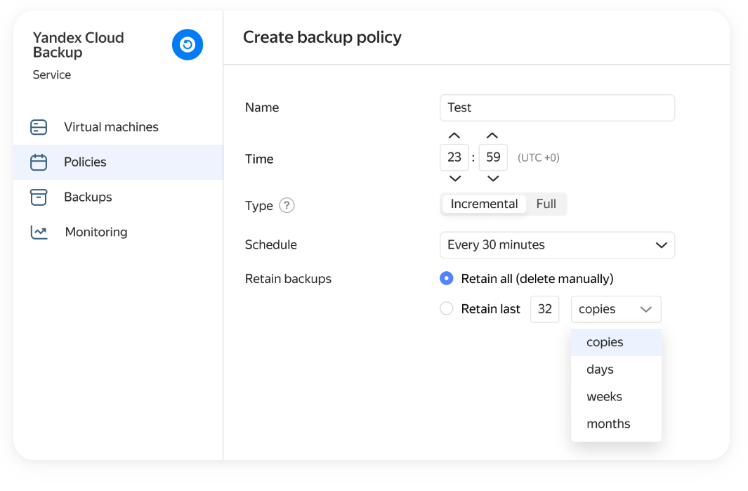 Yandex Cloud Backup provides a solution for safeguarding application data while ensuring its reliability through the use of the Cloud Backup agent installed in the guest operating system. Users can retrieve specific files from backups and place them in the correct directory of the current version of the virtual machine. Additionally, it is possible to establish backup policies for virtual machines across the entire cloud via the console, and these policies can be applied during the virtual machine configuration process. All backup tasks are executed in the cloud environment, necessitating only the setup and application of policies to the designated virtual machines. In contrast to a simple disk snapshot, this service generates copies of all virtual machine disks, which encompasses network SSDs, HDDs, non-replicated disks, and dedicated host local disks. If reverting the current virtual machine to a prior state proves unfeasible, users have the option to restore the backup to a newly created virtual machine, thus ensuring flexibility and resilience in data management. This capability makes Yandex Cloud Backup a comprehensive tool for managing not just backups but also the overall integrity of applications running in the cloud.
