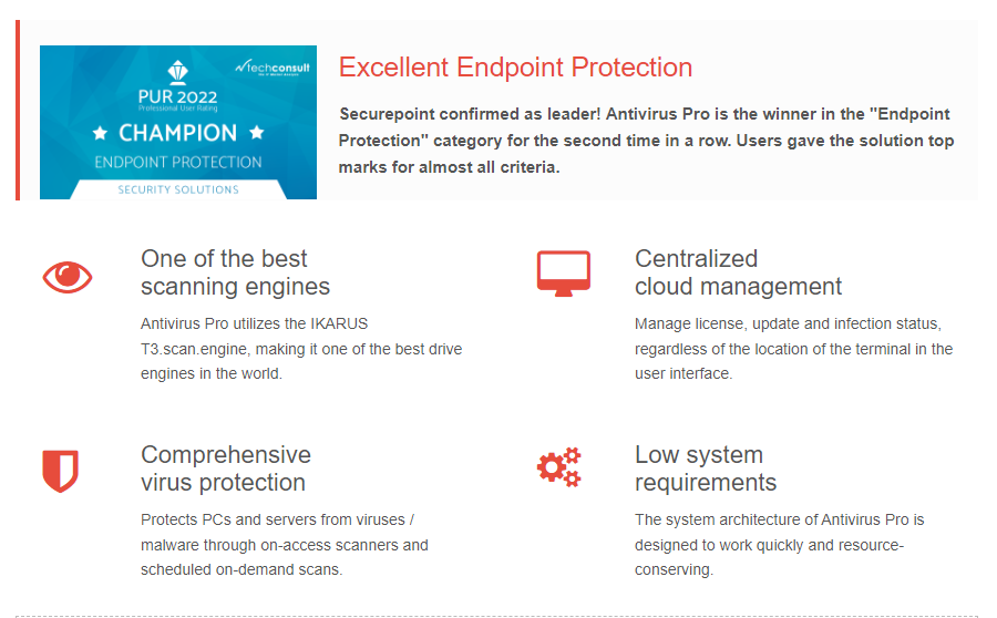 Antivirus Pro stands out as one of the premier scanning engines available today, powered by the advanced IKARUS T3.scan.engine, which places it among the top drive engines globally. It features centralized cloud management that allows users to oversee licenses, updates, and infection statuses from anywhere via its user-friendly interface. This antivirus solution also offers thorough virus protection for both PCs and servers, employing on-access scanners along with scheduled on-demand scans to detect and eliminate threats. Furthermore, it is designed with low system requirements, ensuring efficient and resource-friendly operation. By utilizing Antivirus Pro, Securepoint provides a compelling endpoint antivirus solution enhanced by centralized cloud management capabilities. Users can effortlessly access a free management portal that displays all client systems, including relevant details such as license information, update status, and infection reports. Additionally, IT service providers and retailers benefit from the convenience of accessing comprehensive customer data through a single login, streamlining their operations and enhancing service delivery. The combination of these features makes Antivirus Pro a standout choice for effective digital security management.