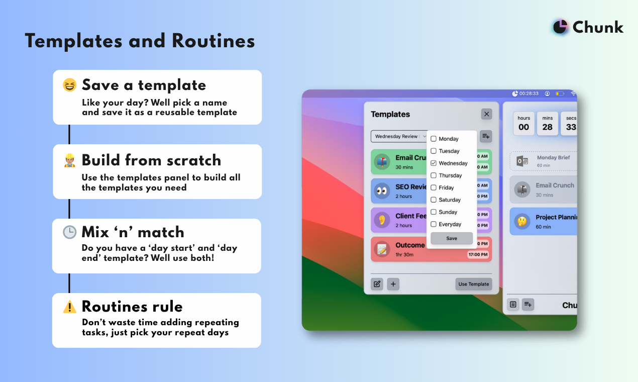 Chunk is a powerful macOS app designed to serve as your command center for time blocking and task management, helping users maintain deep focus and productivity. It provides fullscreen alerts that serve as clear reminders, minimizing distractions and keeping you fully engaged. The app integrates effortlessly with Apple, Google, and Outlook calendars, allowing seamless synchronization across your scheduling platforms. Users can build reusable routines and templates, making daily planning faster and more efficient. Adding tasks quickly with one click makes managing your to-do list easy and intuitive. Chunk also enables you to shift your entire day forward or backward, providing flexibility when unexpected changes occur. Designed for professionals, students, freelancers, and even those with ADHD, it offers structure without complexity. Chunk helps you stay organized and in flow, no matter how busy your day gets.