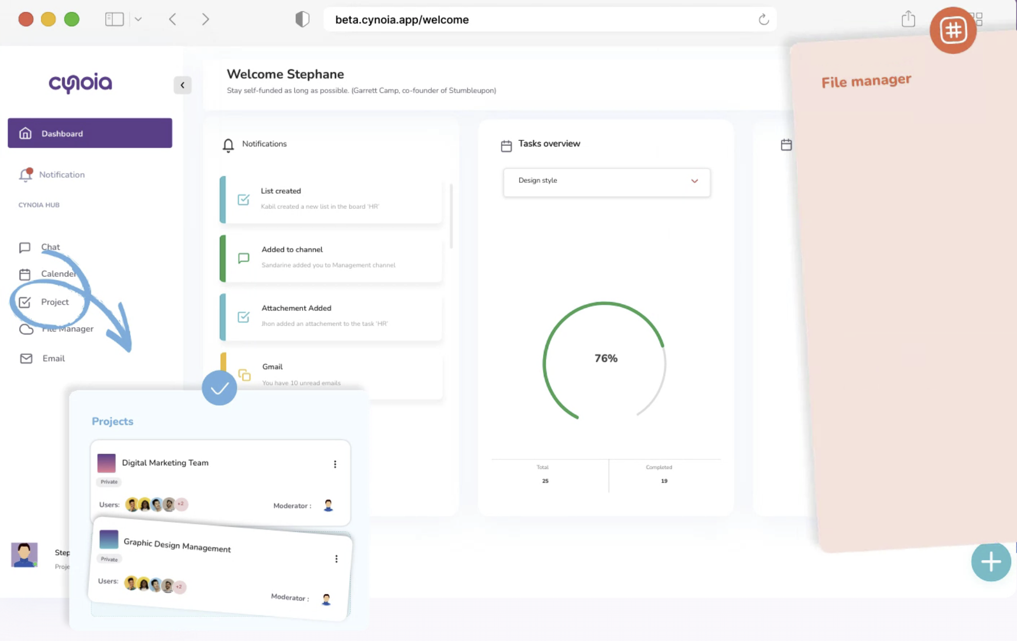Work together as though you were in the same space. Cynoia aligns seamlessly with the unique rhythm of your team, no matter what your role, size or location. This optimizes your processes and ensures you shine. We simplify team collaboration through the integration of various communication channels onto one platform. Our solution allows businesses to manage their workflows easily, increasing efficiency and reducing time spent on managing tasks. The interface of Cynoia is tailored to the unique needs of each company, making it a perfect solution for many industries.