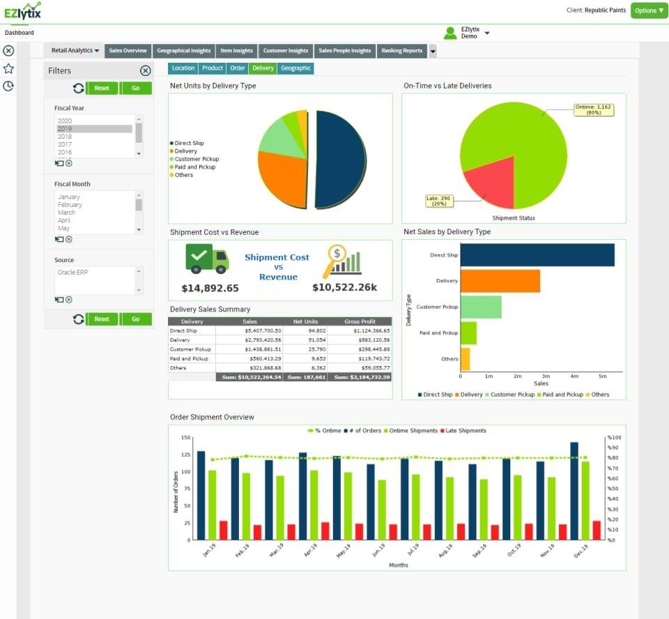 EZlytix offers cloud-based analytics in a box. Our solution is ideal for mid-market manufacturing, distribution, retail organizations, and small-mid-sized law firms. EZlytix combines data from multiple sources, including ERPs (Infor NetSuite Syspro, Odoo, MS Dynamics, Syspro and Syspro), Salesforce, Magento Law Practice Management Software (Clio Manage & Grow), Google Analytics and Facebook. You can also get business insights through pre-built dashboards or reports.
