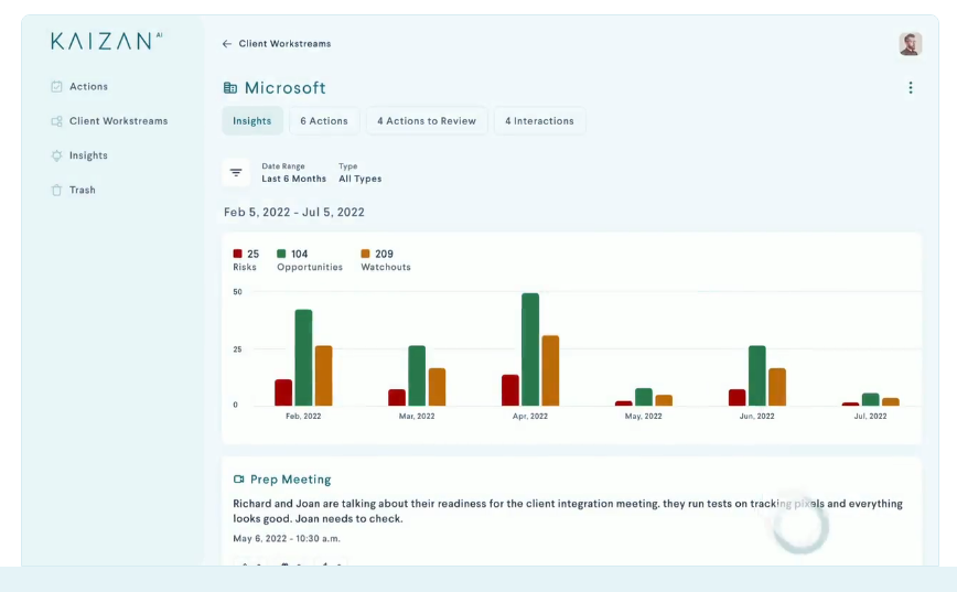 Kaizan leverages conversation intelligence to illuminate client health metrics and identify revenue-boosting opportunities. It is at the forefront of revolutionizing relationship management through dynamic, client-focused teams. With Kaizan's advanced client intelligence platform, your organization can effectively retain and grow its client base. Utilizing sophisticated language models, Kaizan distills essential tasks and actions necessary for fostering client success. The platform generates comprehensive work streams for clients, including summaries of discussions, actionable next steps, and assessments of risks and opportunities, all aimed at enhancing client retention and expansion. Additionally, it provides an impartial perspective on the actual dynamics within your client portfolio. Effective stakeholder mapping plays a vital role in cultivating client relationships, as it fosters trust, encourages open communication, and facilitates collaborative partnerships. In this context, we offer practical tips for successful stakeholder mapping, ultimately delivering insights that drive revenue growth. By implementing these strategies, businesses can significantly improve their approach to client engagement.