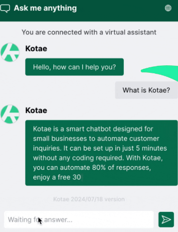 Streamline customer support through an AI chatbot that utilizes your own content while remaining under your control. Personalize and train Kotae by utilizing data from your website, training documents, and frequently asked questions. Allow Kotae to handle customer inquiries, generating answers based on your proprietary information. Customize Kotae’s look to reflect your brand identity by including your logo, choosing theme colors, and crafting a welcome message. Additionally, you have the option to modify AI-generated responses by setting up a tailored FAQ section. Our technology integrates cutting-edge advancements in chatbot capabilities, employing OpenAI and retrieval-augmented generation techniques. You can further improve Kotae's performance over time by analyzing chat history and integrating additional training materials. Available around the clock, Kotae serves as an intelligent and adaptive assistant to meet your needs. It can support your customers in more than 80 languages, ensuring comprehensive assistance across diverse demographics. Our services are especially beneficial for small businesses, featuring dedicated onboarding support in both Japanese and English to facilitate a smooth transition.