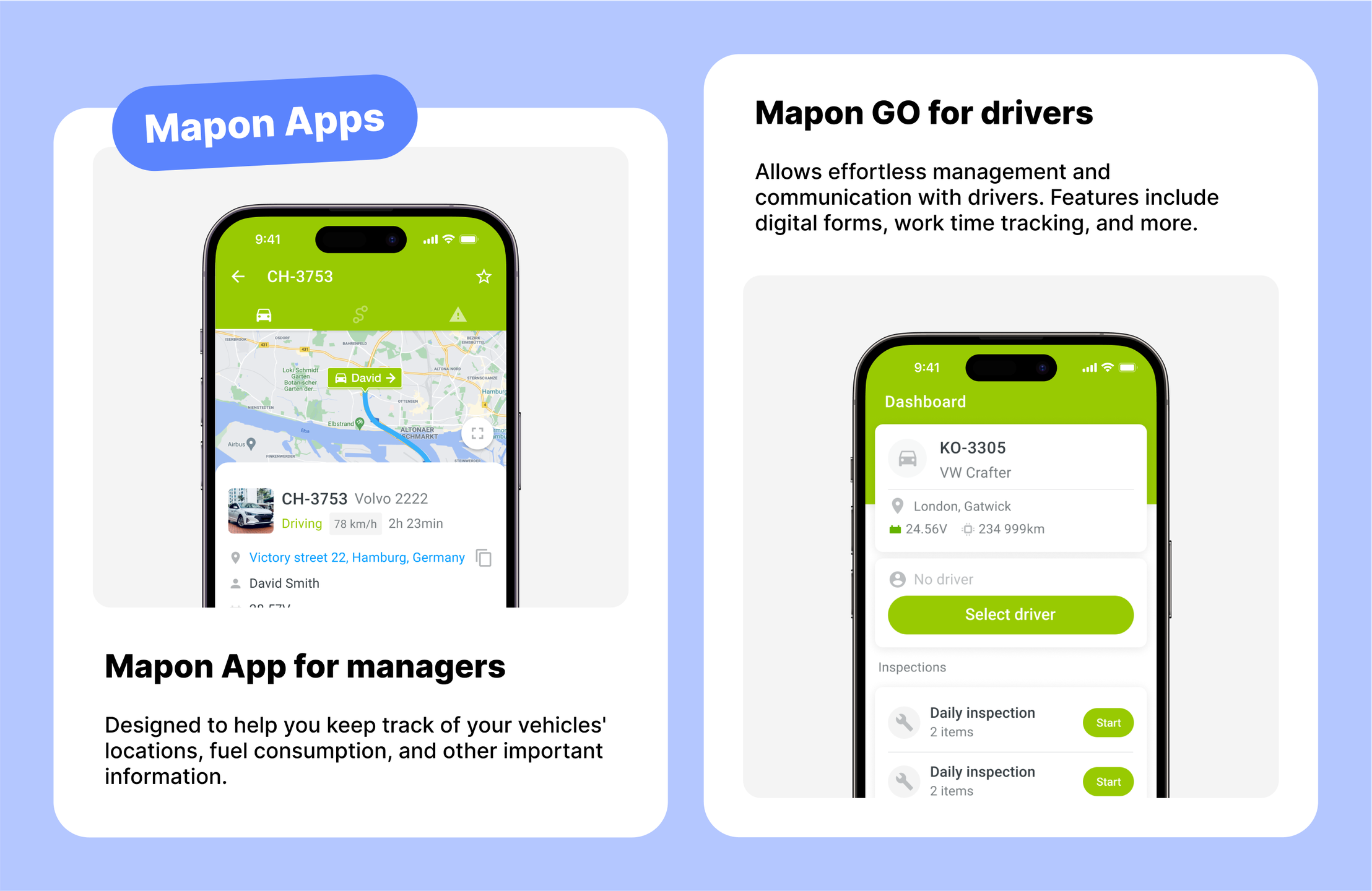 Mapon is one of the leading fleet management and asset tracking solution providers in Northern Europe. Our effective solutions can benefit every fleet – they include GPS tracking with live data, fuel consumption management, fleet maintenance, asset tracking, driver behaviour, and camera systems. The use of these solutions is made easy through mobile app access for managers and drivers.