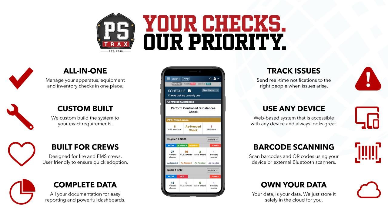 We custom configure cloud-based checks to make Fire & EMS agencies more efficient and compliant while minimizing redundancies and exposure. Your department must keep track of thousands upon thousands of pages of logs, maintenance requests, check sheets, and other documents that are scattered among different stations and personnel. PSTrax consolidates all these checks into a single program that tracks, documents, and schedules everything digitally. We design the system to your specifications - every apparatus, each piece of equipment, inventory, and every check. Crews know exactly what to inspect and when. PSTrax is simple to use and quickly adopted by crews. It looks great on any device and is accessible from any device with Internet access. We are confident that your crews will love it.