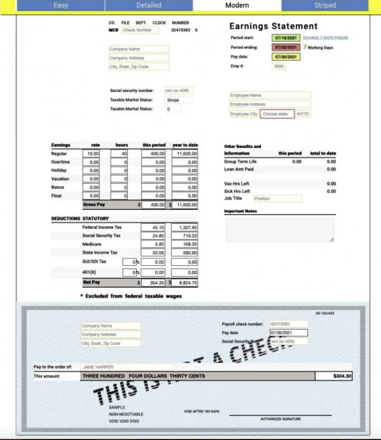 A pay stub can be described as a piece of paper that we keep after we cash our payroll checks. A pay stub is not only a proof of income but also helps you to keep track of your salary, taxes paid, overtime, and other information. Our pay stub creator is unlike any other online paystub maker and takes less than two minutes to complete. Our pay stub software only requires you to provide information such as your salary and the name of the company. With our paycheck stub software, you can easily keep track of your finances. You can also secure bank loans, apply for credit cards, and use the stub to prove your income. A Pay stub, which is usually provided by employers, details the employee's earnings, employer contributions and other payroll data. We are referring here to the net pay and not the gross pay. This is the amount that the employee receives in a pay period.