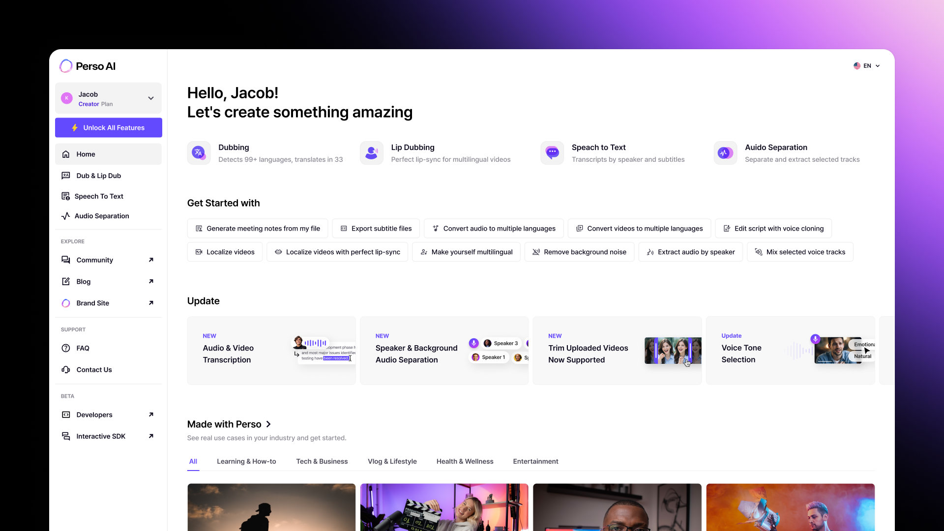 Experience effortless localization of your content through advanced translation, voice cloning, and robust multilingual support all conveniently accessible. Effortlessly engage a worldwide audience while ensuring your message is clear and impactful. Our system can accommodate up to 10 speakers simultaneously, employing automatic speaker recognition for optimal accuracy. By cloning any voice, we help maintain your brand's unique identity across various international markets. You will also receive translated transcripts and audio clips that can be utilized for further editing. Our cutting-edge AI not only translates spoken dialogue but also replicates the original speaker's voice in the selected language, providing a smooth and authentic listening experience for your audience. This innovative process is perfect for content creators, businesses, and educators aiming to expand their reach globally without the challenges of requiring multilingual speakers or the hassle of extensive re-recording. With this technology, you can effortlessly present your ideas to diverse audiences around the world while preserving the essence of your original message.