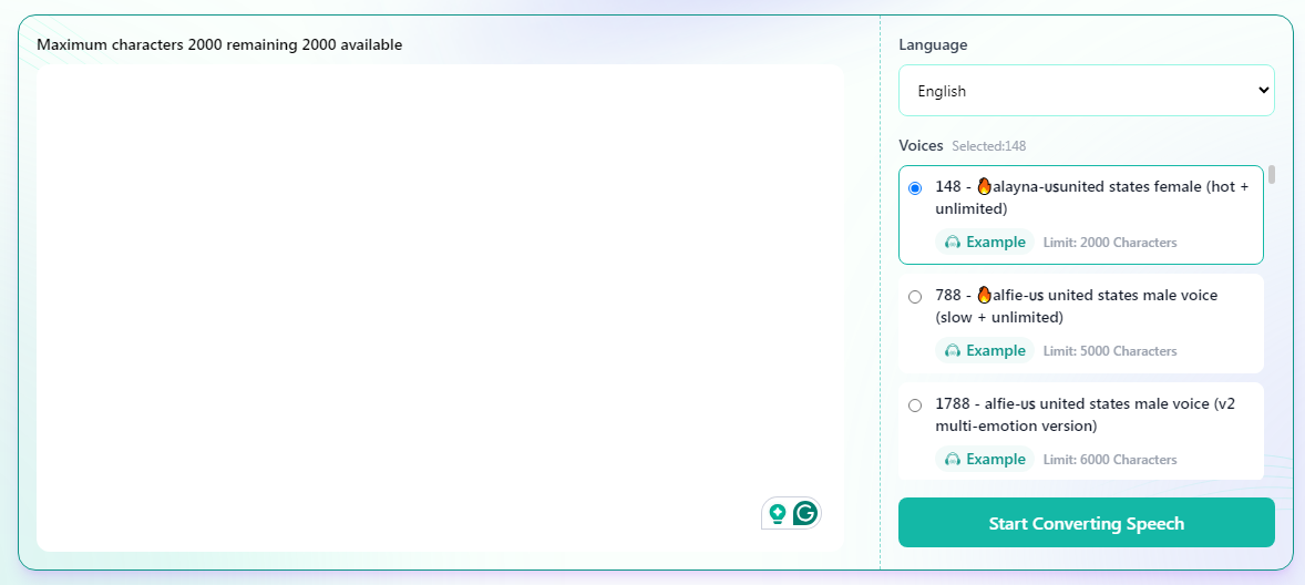 Luvvoice is an easy-to-use text-to-speech converter that allows you to transform any written content into clear, natural-sounding audio. Supporting various languages and a wide selection of voices, it’s perfect for creating accessible content, audiobooks, or even voiceovers for videos. There are no word limits, meaning users can convert long documents or articles into audio with just a few clicks. Luvvoice offers a free, intuitive platform for anyone looking to convert text to speech without hassle.