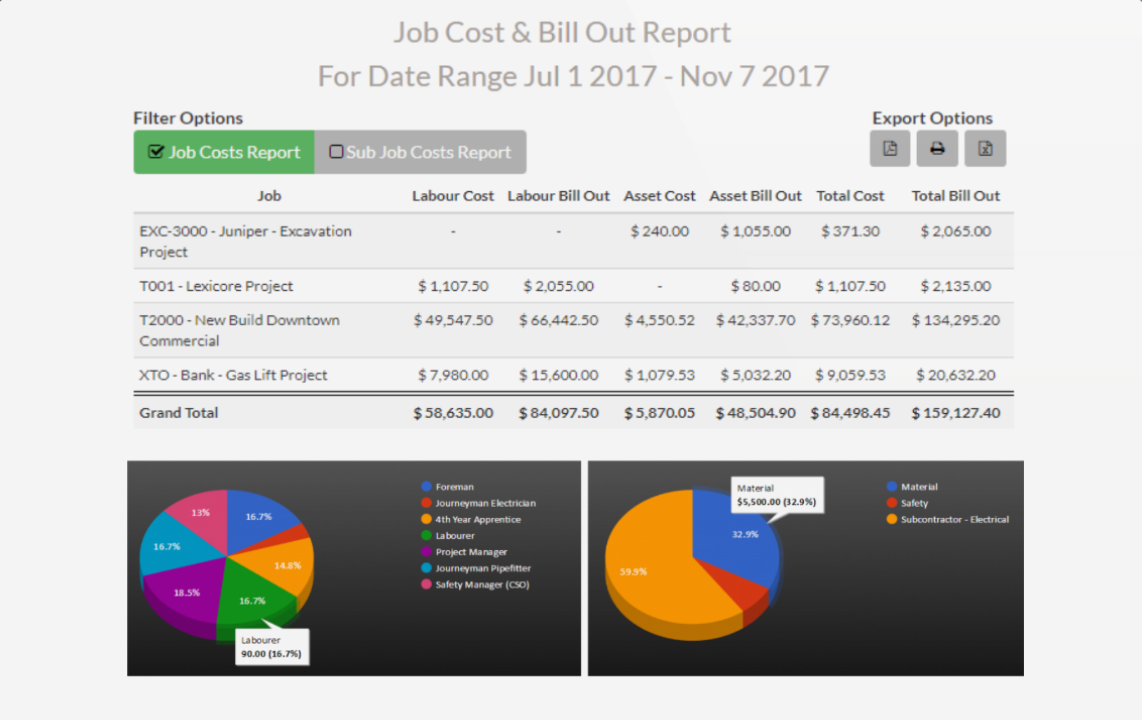 Positive: That employee and contractor hours and costs along with 3rd party invoices, asset and other charges can be input to creat a Labour, Equipment & Materials (LEM) report that summarizes all job costs and provides a detailed invoice backup.