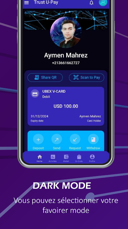 UbexPay allows you to manage your money with secure worldwide security protocols. You can receive your payment from anywhere in the world in a matter of seconds, pay online, or in shops by QrCode and NFC.