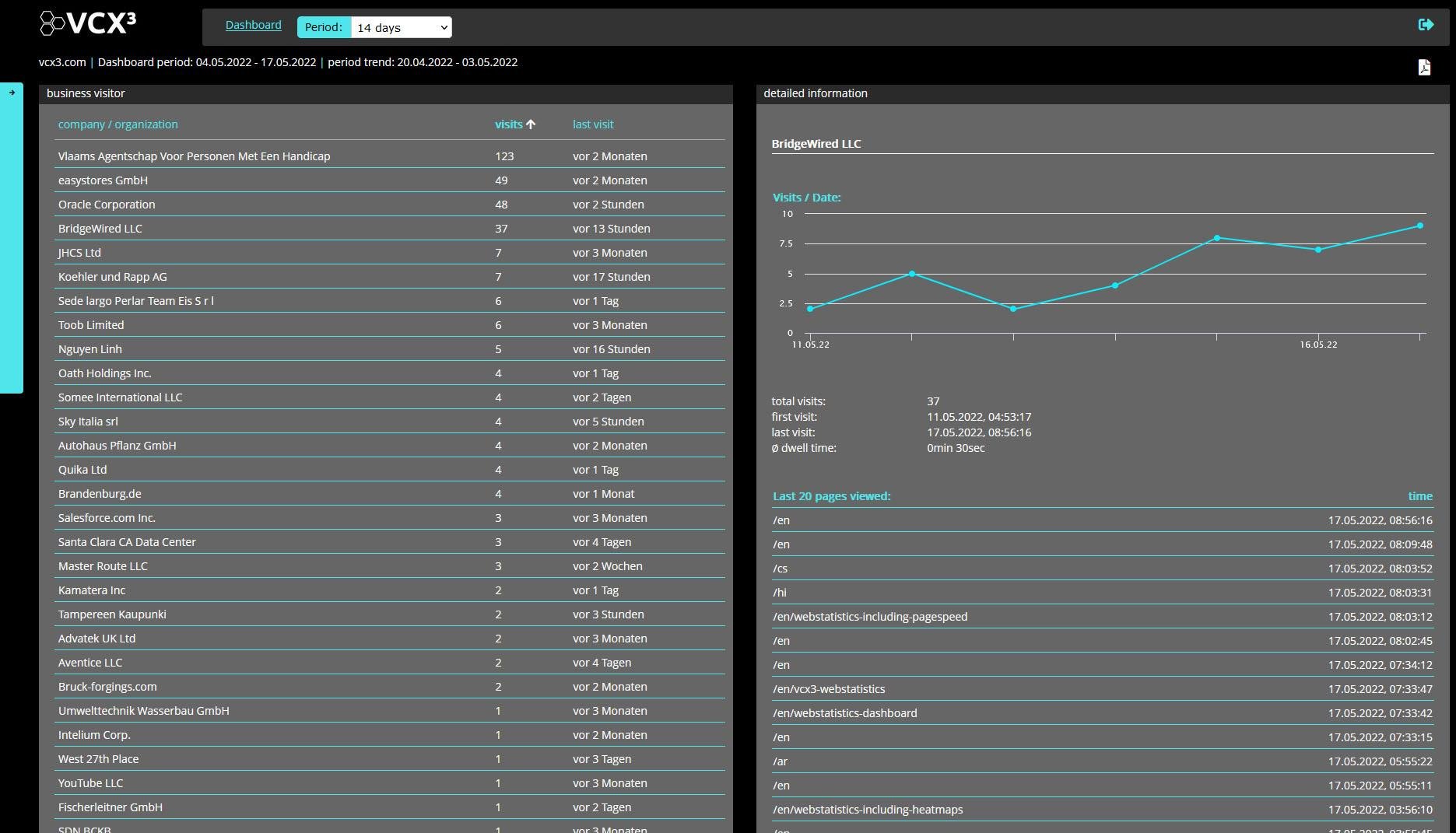 VCX³ is a SaaS that offers an all-in-one solution for website owners to manage their web statistics. With VCX³ you will get access to detailed statistics, heatmaps, backlink-check, pagespeed-check, cart-tracking, campaign-tracking, list of business-visitors, bounce-rates, file-downloads, devices (down to smartphone model) and much more - and most important: it's working without cookies!
