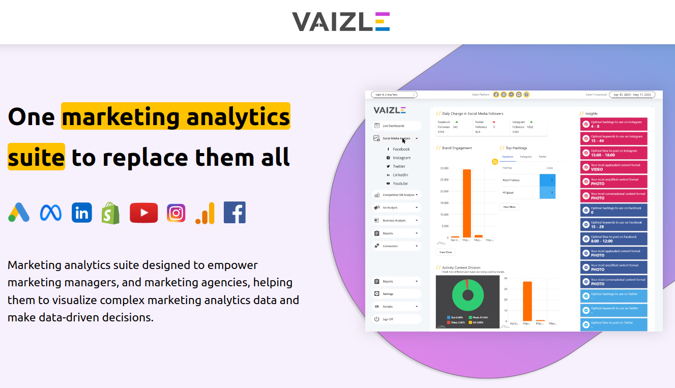Vaizle is a marketing analytics suite designed to help marketers plan, execute, measure and analyze cross channel marketing campaigns. Through it, companies are able to visualize complex marketing analytics data and make data-driven, informed decisions. This marketing analytics suite provides marketers with features for social media and ad analytics that simplify their day-to-day tasks.