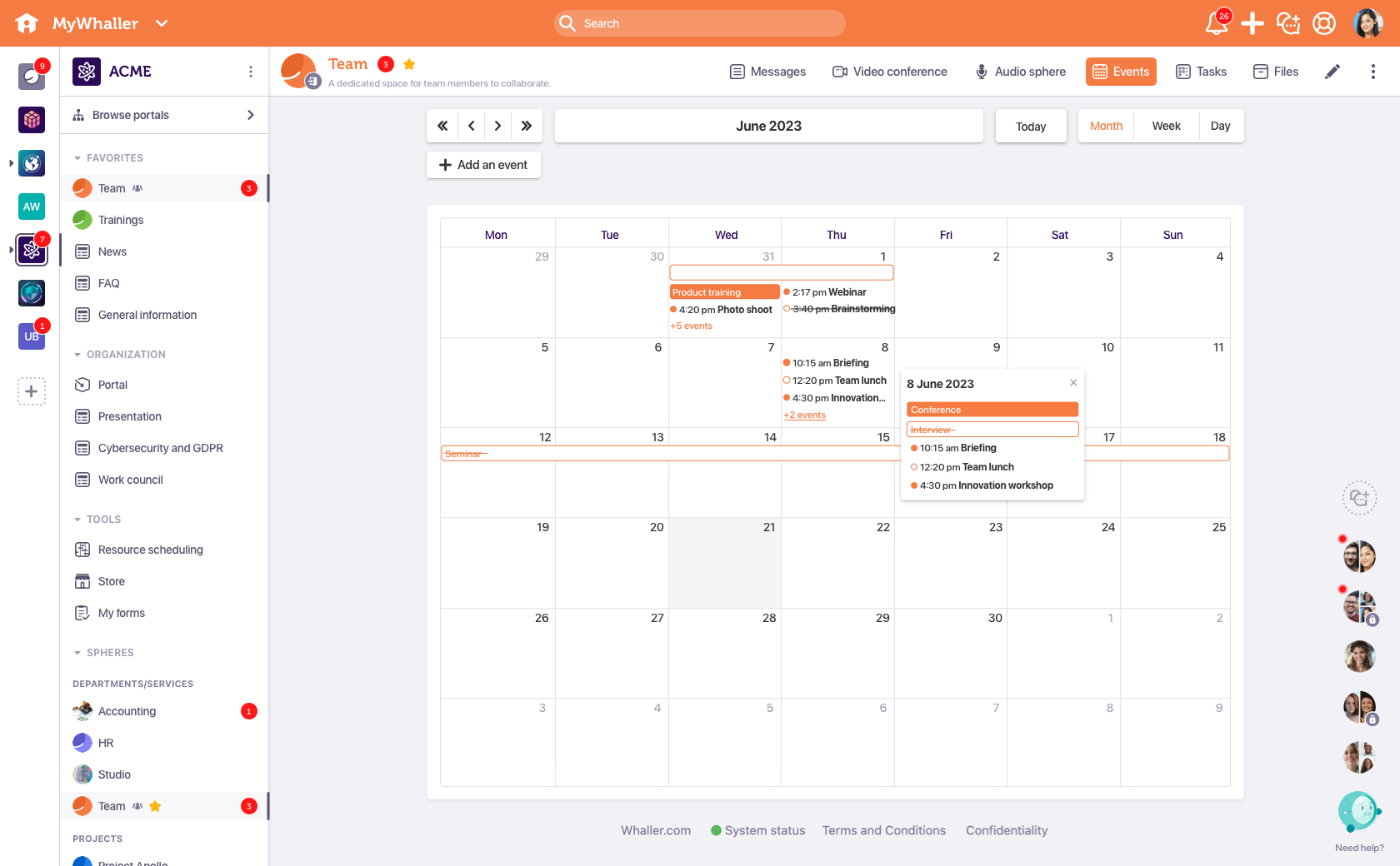 The platform connects all members of an organization (employees, students, partners, clients, etc.) and offers essential tools to communicate and collaborate in total security (messaging, video conferencing, file storage, shared calendars,...).