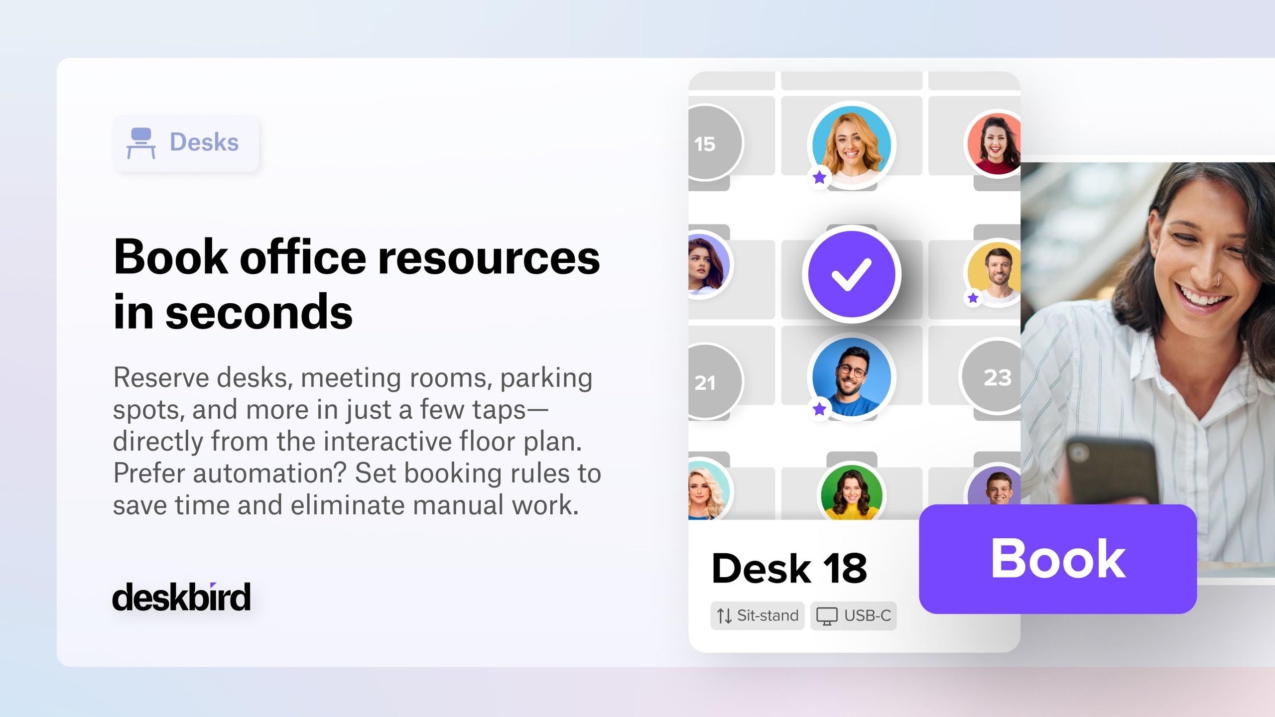 deskbird makes hybrid work simple, saves costs, optimizes office space, boosts productivity, and fosters team collaboration—all in one easy-to-use app.
